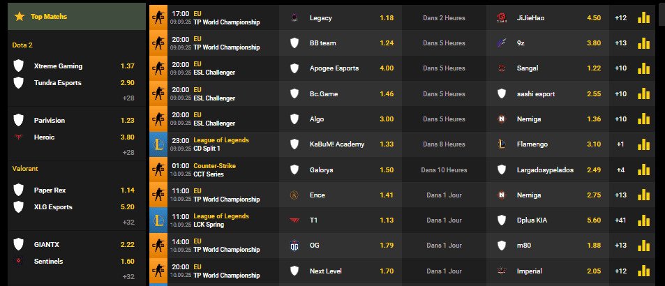 Les paris e-sport sont une forme de jeux d’argent impliquant des mises en argent réel, strictement encadrées par la réglementation en vigueur. Contrairement au simple fait de jouer ou de regarder un match en streaming, les parieurs peuvent ici prédire l’issue d’une rencontre, le score exact ou encore la performance d’un joueur. Sur les sites de paris e-sport, on retrouve la même logique que dans les paris sportifs classiques : le joueur sélectionne un match, choisit un marché (par exemple le vainqueur de la première carte dans League of Legends ou l’équipe qui fera le plus de kills dans CS2), indique un montant d’argent et valide son coupon. Si le pronostic est correct, le gain en argent est calculé en fonction de la cote affichée.