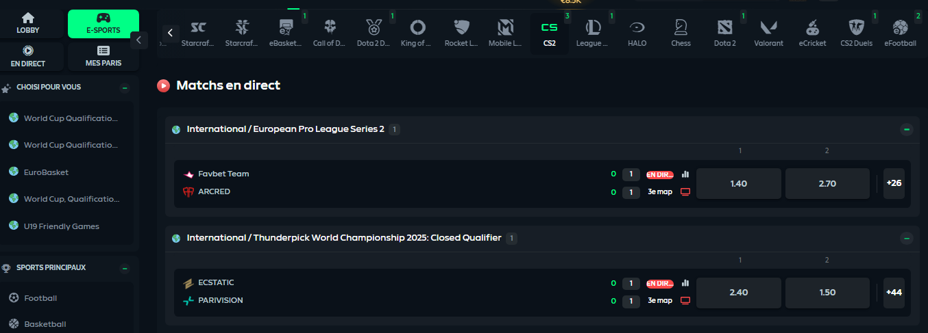 Les paris e-sport sont une forme de jeux d’argent impliquant des mises en argent réel, strictement encadrées par la réglementation en vigueur. Contrairement au simple fait de jouer ou de regarder un match en streaming, les parieurs peuvent ici prédire l’issue d’une rencontre, le score exact ou encore la performance d’un joueur. Sur les sites de paris e-sport, on retrouve la même logique que dans les paris sportifs classiques : le joueur sélectionne un match, choisit un marché (par exemple le vainqueur de la première carte dans League of Legends ou l’équipe qui fera le plus de kills dans CS2), indique un montant d’argent et valide son coupon. Si le pronostic est correct, le gain en argent est calculé en fonction de la cote affichée.